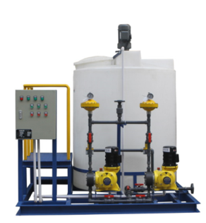 循環冷卻水加藥系統,根據循環冷卻水的濃縮倍數,通過電導率儀檢測循環冷卻的電導率(指標為水的含鹽量)達到一定數值后,控制電磁閥打開,循環冷卻水系統開始排放污水,在排放污水的同時向水中補加新鮮的水,同時向水中投加緩蝕阻垢劑(其投加濃度根據水質和緩蝕阻垢劑的種類)。由于循環冷卻水的堿度偏高,可以通過自動加酸裝置調節其PH值。通過向水中比例投加殺菌滅藻劑,控制循環冷卻水的細菌和粘泥的增長。